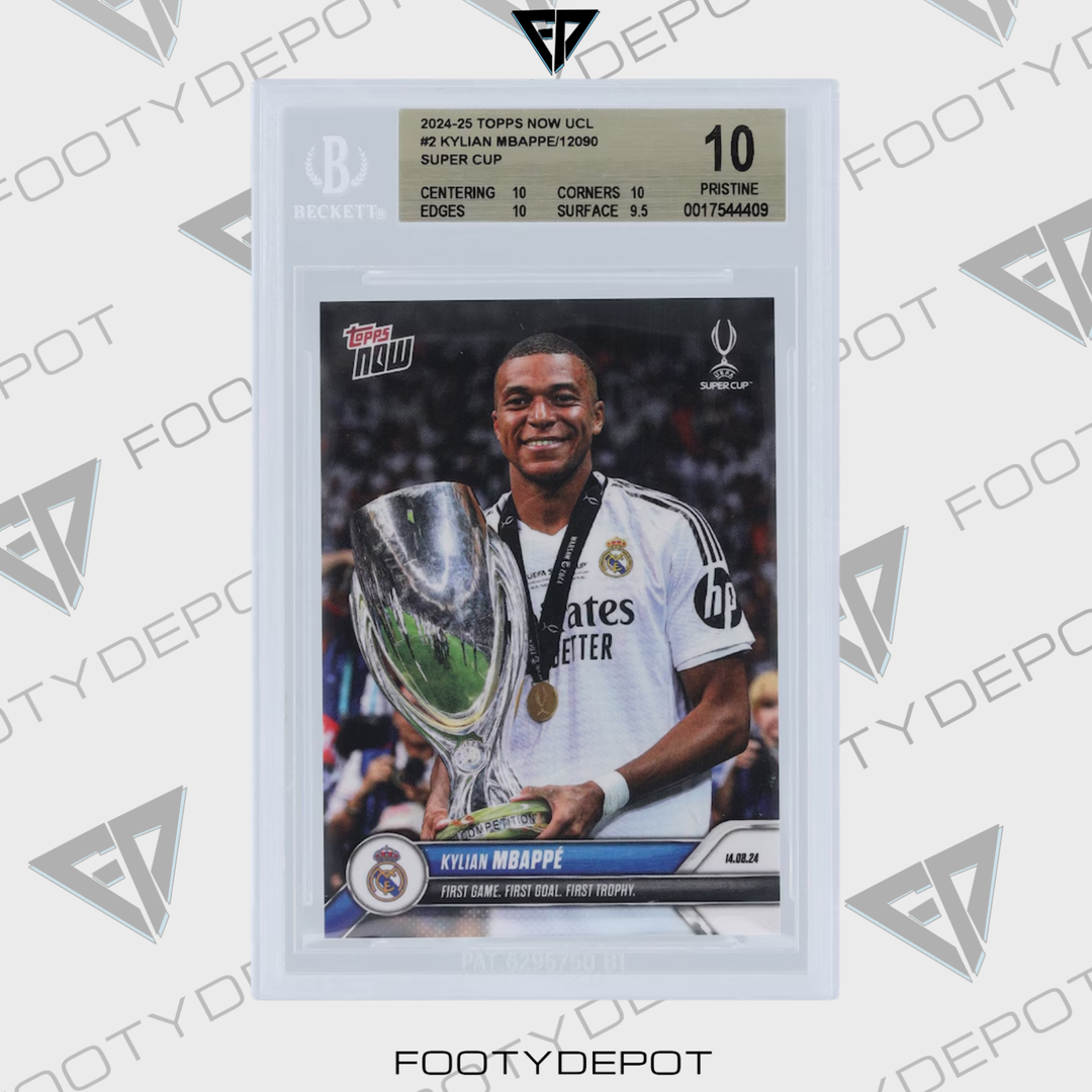 Kylian Mbappé Real Madrid 2024-25 Topps Now UCL First Game. First Goal. First Trophy. #2 BGS Authenticated 10 Card