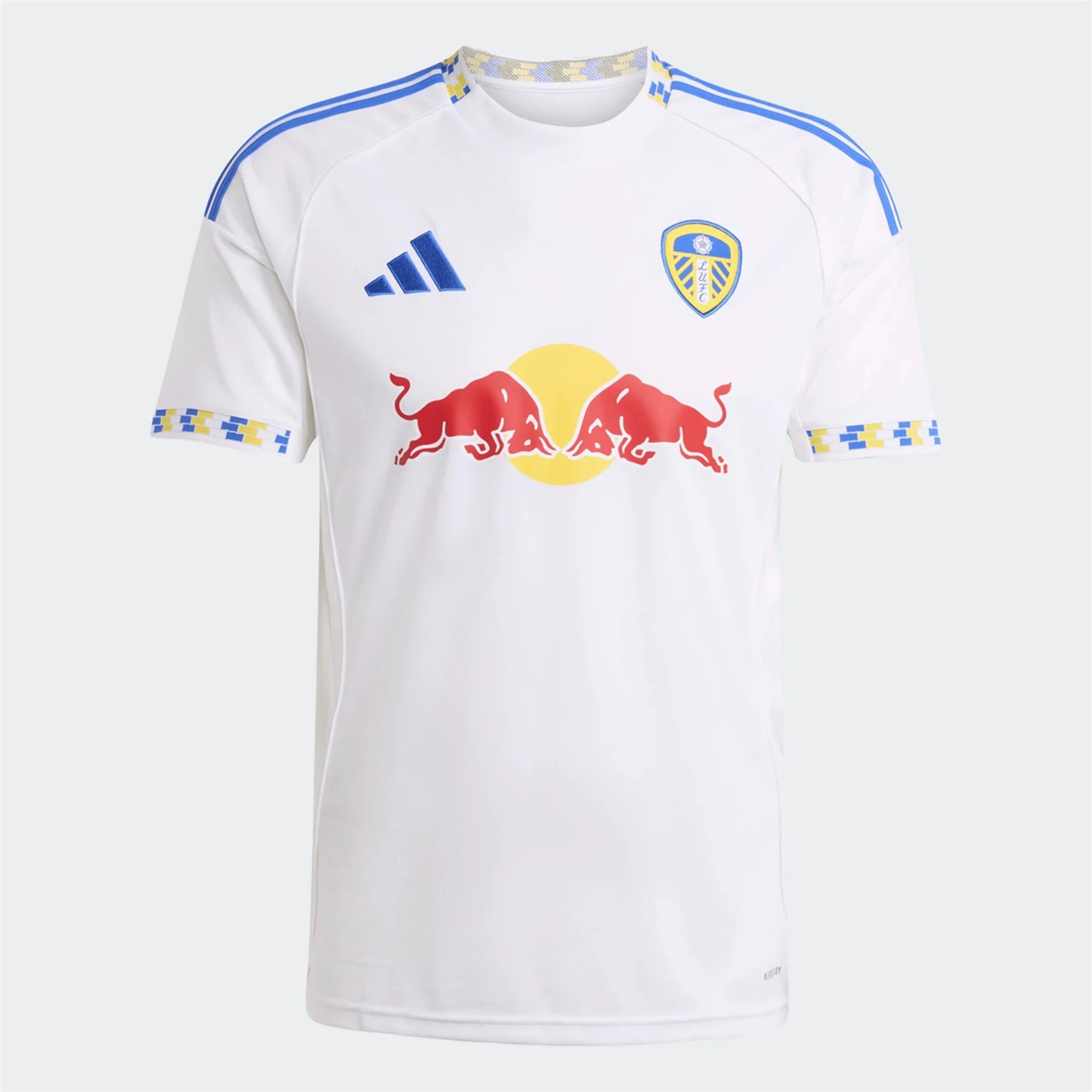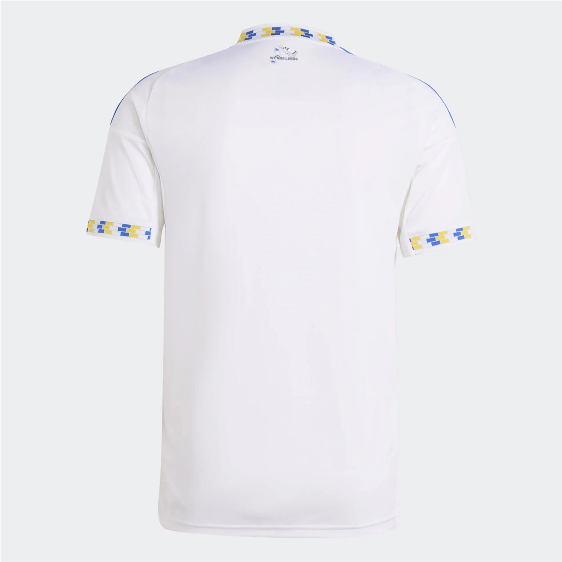 The march to home matches at Elland Road includes the Lowfields Road tunnel, a cherished landmark outside the stadium. The walls of the tunnel are decorated with blue, yellow and white patterned tile that appears on the collar and cuffs of the new home shirt.